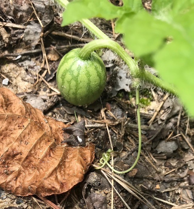 The prime time to harvest watermelons is probably June or July… this little one won’t be ready for a while. I haven’t seen one pumpkin or cantaloupe yet. Maybe more fertilizer is needed ?