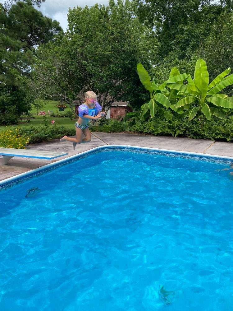We had a couple of children over to swim and they were going off the diving board. One was an older girl who is swimming well and the other a 2 year-old who was using her “puddle-jumper. ” Maeley wanted to try it with her “floaties” but they were at home so our neighbor let her borrow the “puddle-jumper.” To our surprise, she got up on that diving board and jumped off without hesitation !