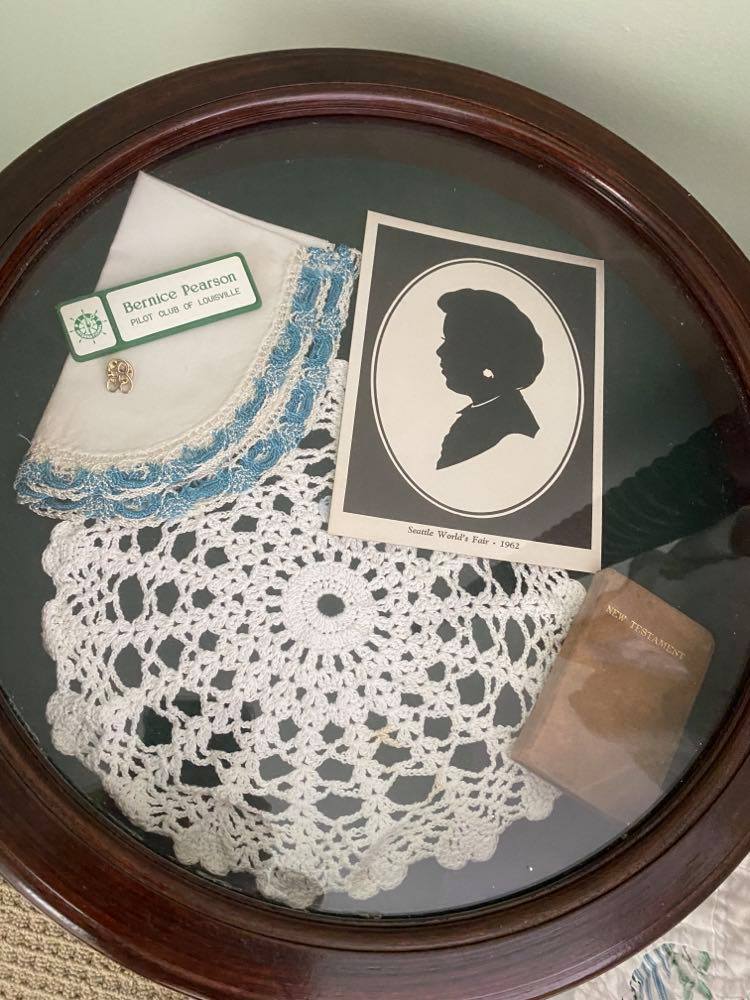 The small table includes a silhouette of her made on a trip with some of her dearest friends to the ‘62 Seattle World’s Fair, a doily crocheted by her mother, one of her handkerchiefs, her initial pin, her childhood New Testament, and her Pilot Club pin.