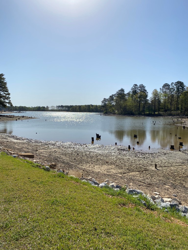 They’re working on the levee at the lake so the water level is way down, revealing lots of stumps.