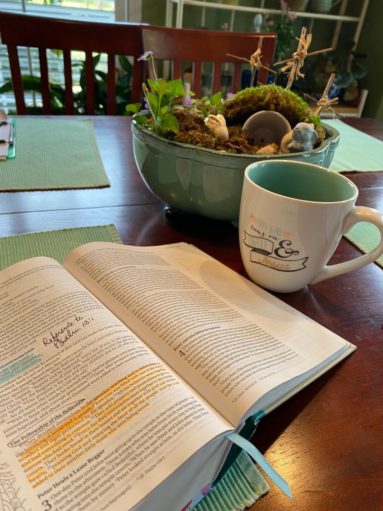I started the day in His word. I have a little vignette on the table featuring the empty tomb with the stone rolled away under the three crosses to remind us of Holy Week and Easter.